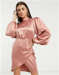 Flounce London high neck lantern sleeve drape mini dress in mink-Pink